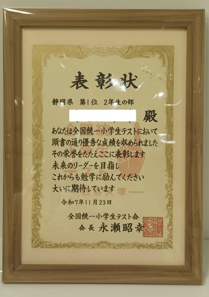 11月3日に行われた全国統一小学生テストにて、富士学院に通う小学2年生の生徒さんが受賞しました。